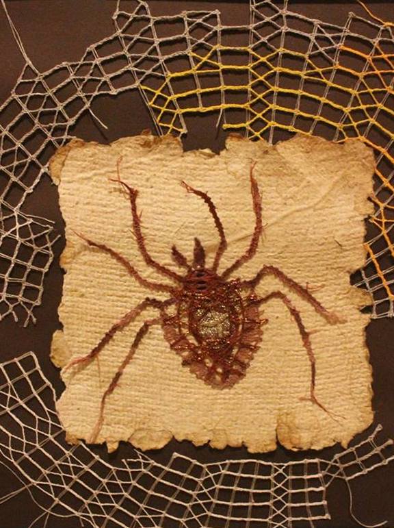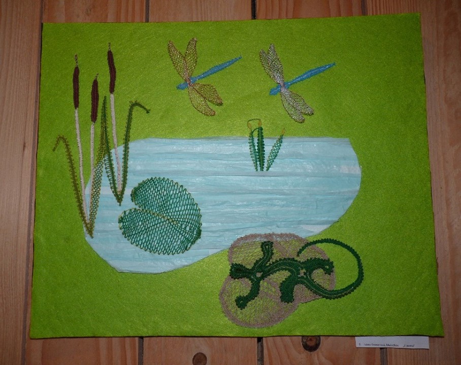 V Prešově na Slovensku se každé dva roky koná Mezinárodní festival paličkované krajky. Byla i vyhlášená soutěž na téma „Z říše hmyzu“, kam jsem se rozhodla, že pošlu nějaké své dílo. Na jednom sobotním kurzu Lenky Malátové, kde se navrhovaly podvinky s acháty, jsem se rozhodla kameny využít právě do prešovské soutěže. Napadlo mne, že bych mohla udělat brouky. Tělo brouka by tvořil achát v krajce. Tvar achátu jsem obkreslila, nakreslila podvinek pro krajku, který tvořil dvě části pro každého brouka. Jedna část tvořila celé tělo včetně končetin a hlavy, druhá část byl jen lem kolem achátu. Vše jsem upaličkovala zlatou a stříbrnou nití. Obě strany jsem sešila k sobě, ale ještě před došitím jsem mezi dvě části vložila achát. Achát byl uprostřed krajky a tvořil tedy barevné tělo brouka. Takto jsem upaličkovala berušku, roháče, tesaříka a další dva brouky. Mezi vytvořené brouky jsem upaličkovala plátnem zelenou trávu, ke které jsem brouky přišila. Vše bylo uprostřed hnědého rámečku bez podkladu. Rámeček se udělal z obou stran, takže dílo „Brouci v trávě“ je oboustranné a dá se pověsit do okna a brouci z achátu pěkně vyniknou přes průsvit světla. Tato práce mě naučila, jak pracovat a využít acháty či jiné kameny v krajce a k danému tématu.