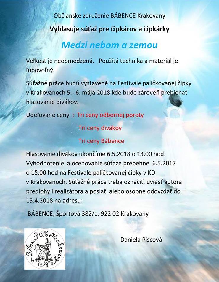 Druhý ročník pro krajkářky a krajkáře vyhlásily Krakovany na Slovensku na téma „Mezi nebem a zemí“. Zaslané soutěžní práce budou součástí festivalu ve dnech 5. – 7. 5. 2018 v Krakovanech, kde bude také probíhat hlasování návštěvníků, a potom i vyhodnocení a předání cen.