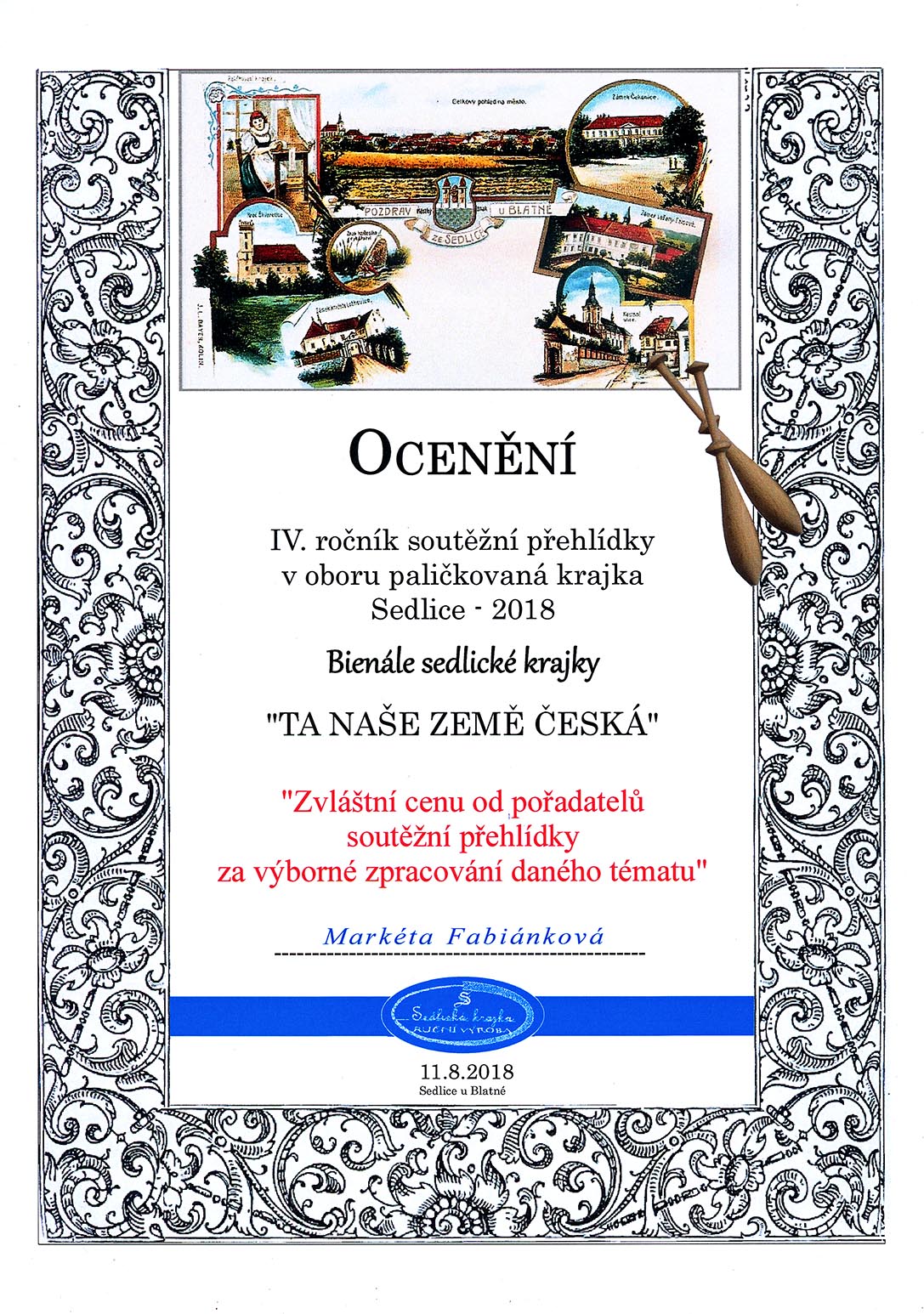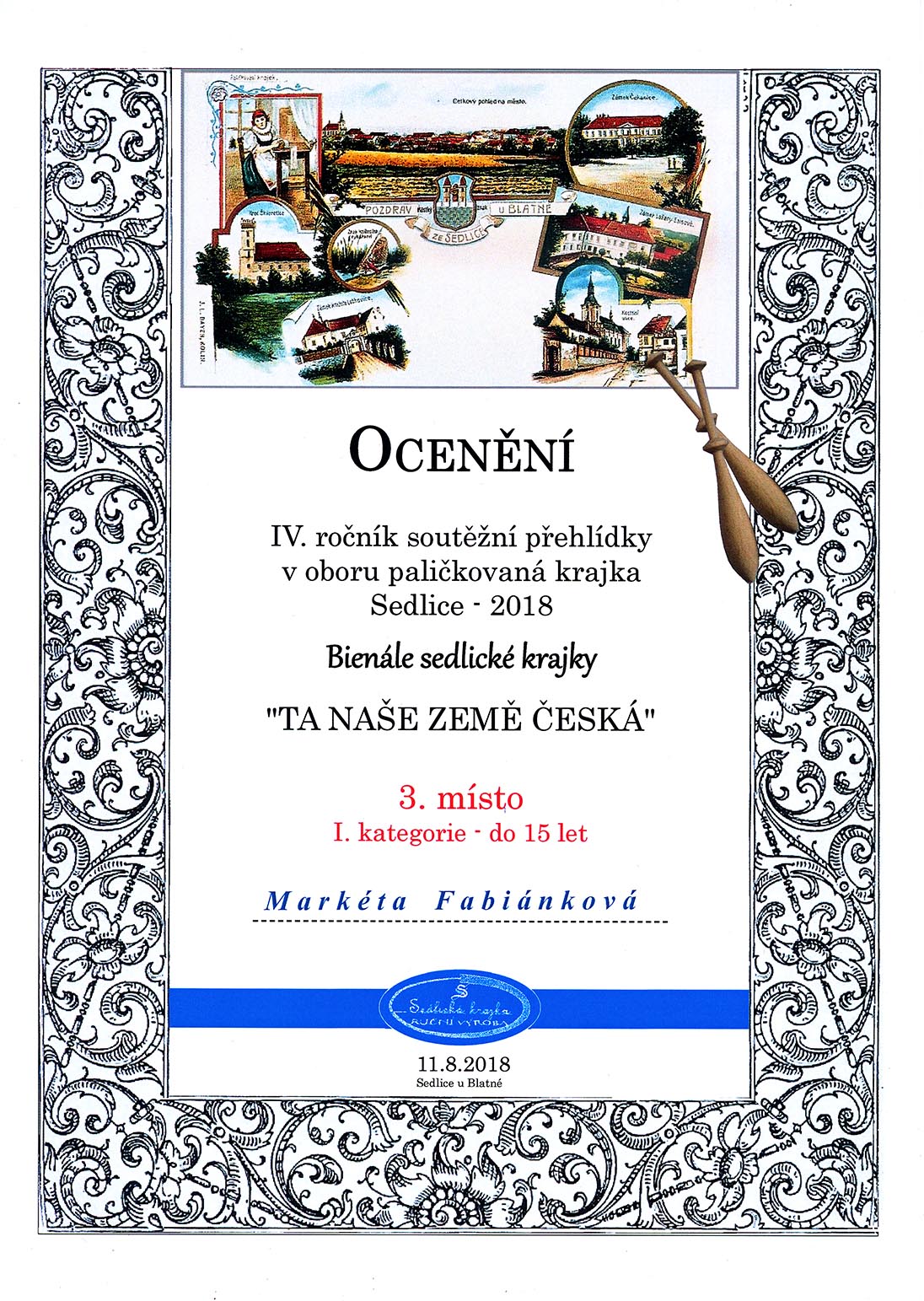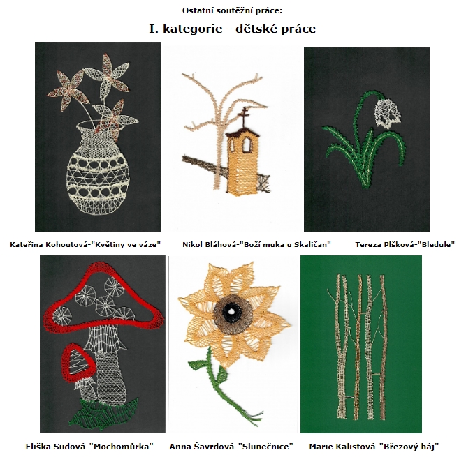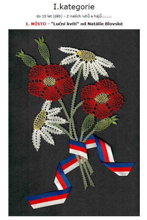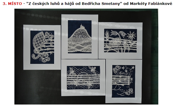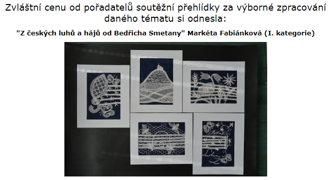 Na soutěž, kterou pořádali Sedlice u Blatné a které jsem se také chtěla zúčastnit, jsem měla na zhotovení jen dva měsíce do odeslání. Téma bylo zaměřeno stejně jako v Prachaticích ke stému výročí založení Československa. Mladší kategorie do 15 – ti let měla znění „Z našich luhů a hájů“. Když jsem uviděla název tohoto tématu, napadlo mě upaličkovat pět menších na sebe navazujících obrázků, které mají tvořit skladbu od Bedřicha Smetany z Mé vlasti, kde se jedna část jmenuje Z českých luhů a hájů, podobně jako téma soutěže. Každý obrázek má připomínat jednu část naší přírody, krajiny, luk, polí, lesů, živočichů, rostlin, prostě všechno, co je u nás krásné. Všechny obrázky měly být propojeny pěti linkami, které tvoří hudební osnovu skladby. První obrázek začíná houslovým klíčem, který má také připomínat strom a vedle něho jsou motýlci a rozkvetlé kytičky jako noty. Druhý obrázek je hora Říp, symbol české země a na ní rotunda svatého Jiří. Pod horou je les a políčka. Každé políčko je jiné, protože se na každém pěstuje něco jiného. Pět linek jako osnova prochází jako proplétané přes políčka a jedna tvoří horu Říp. Další obrázek je luční a polní kvítí s klasy. Na předposledním obrázku jsou včeličky, úl a včelí plástve. Poslední obrázek má ukončovat celou skladbu. Obrázek je podobný prvnímu. Jsou na něm motýlci, kytičky a také podpis Bedřicha Smetany. Linková osnova je zakončená dvojitou čárou, jako bývá u skladeb. Všechny části obrázků byly dány do bílých rámečků a celé dílo bylo nazváno stejně jako cyklus Mé vlasti „Z českých luhů a hájů od Bedřicha Smetany“. Sice jsem měla v plánu udělat celkem osm obrázků, ale časově jsem stihla udělat pouze pět. Snad někdy dopaličkuji zbylé tři obrázky. Celé dílo získalo v Sedlicích třetí místo odborné poroty a zvláštní cenu od pořadatelů soutěžní přehlídky za výborné zpracování daného témata. Všechno mě moc potěšilo a byla jsem rád, že jsem dílo stihla včas udělat a odeslat. A co mi soutěž dala? Že se prostě dá všechno stihnout, když se chce a hlavně jsem se naučila navrhnout soubor obrázků.