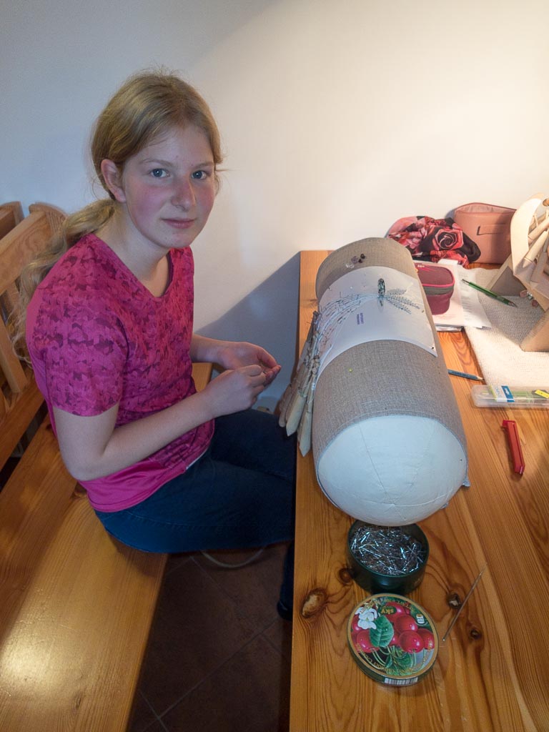 Lenka Malátová pořádá každý podzim pobytový týden s paličkováním v Beskydech kousek od Rožnova pod Radhoštěm. Jelikož nejsem ještě dospělá, jela jsem tam s mámou, která ale nepaličkuje. Dopoledne bylo pro účastníky pobytu volné, takže jsme s mámou chodily na výlety po okolí Beskyd. Navštívily jsme nejen nejbližší okolí Vigantic, ale i Radhošť s Pustevnami, přírodní galerii dřevěných soch na Soláni a vrchol Tanečnice. Bylo to tam moc pěkné, svítilo sluníčko a byl barevný podzim. Odpoledne jsme potom ve společenské místnosti paličkovali. Letos se paličkovala ozdoba s kroužkem, který spínal cípy šátku kolem krku. Podvinky navrhla Lenka Malátová, každý si jeden z nich vybral a ten si pak paličkoval. Za čtyři dny pobytu to každý stihl, někdo dokonce ještě jednu ozdobu na šátek navíc. Celý pobyt se mi moc líbil a byla jsem moc ráda, že jsem tam mohla jet.