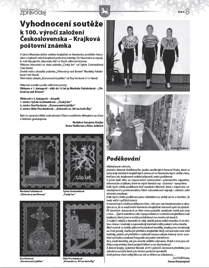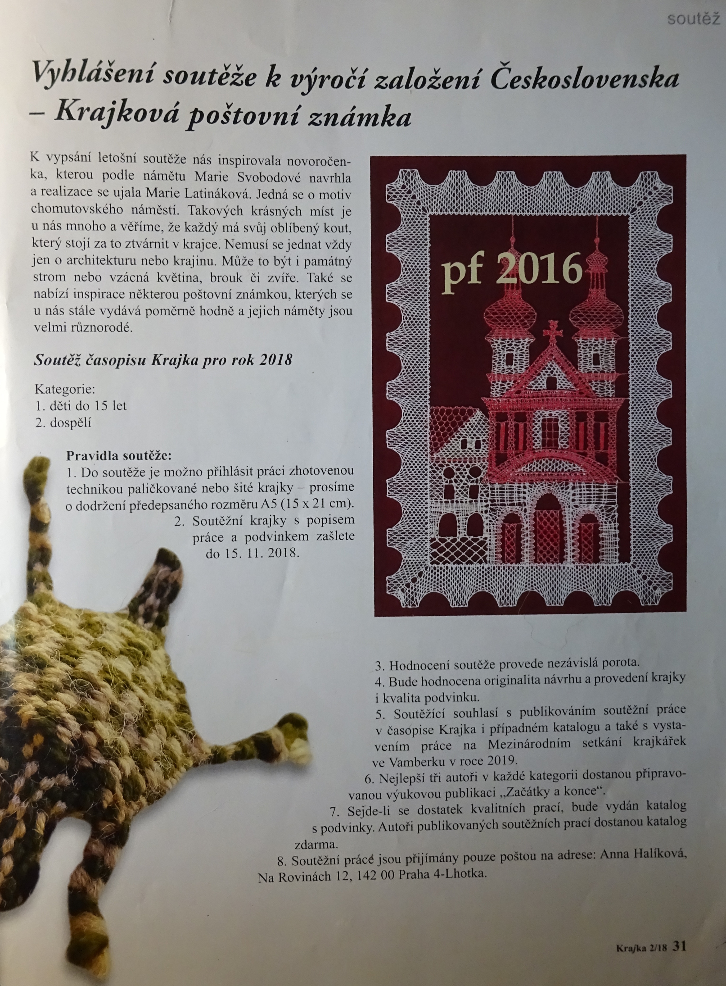 V časopisu Krajka 1/2019 byly nafoceny soutěžní poštovní známky, aby mohli čtenáři časopisu hlasovat mailem pro jednu soutěžní práci. Další hlasování bylo možné na setkání krajkářek ve Vamberku na konci června 2019.