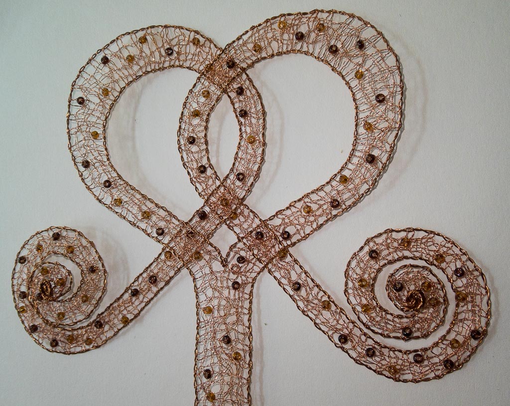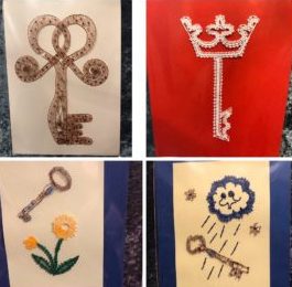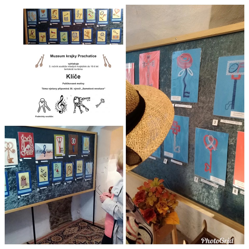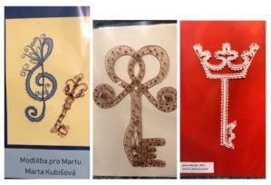 Jako už předchozí roky jsem se rozhodla znovu přispět do soutěže v Prachaticích. Tentokrát bylo téma „Klíče“, který měl připomínat 30. výročí sametové revoluce. Chtěla jsem udělat klasický, ale zdobnější klíč. Tak jsem si ho navrhla a upaličkovala z měděných drátků, protože klíč mívá tuto barvu. Do klíče jsem dala ještě korálky. Klíč má v sobě udělaný houslový klíč, jelikož hudba je také klíčem k srdci lidí. Vršek klíče jsem udělala do tvaru srdce. Srdce je také symbolem Václava Havla, který stál u zrodu sametové revoluce a pak byl prezidentem. Klíč je paličkován cuchaninou, která mu dala pěknou strukturu a na práci s drátkem je vhodná, protože u drátku je znát jeho nerovnost a nepřizpůsobivost. Navíc se drátek velmi špatně přiháčkovává, takže je potřeba s tím počítat a dělat práci jedním tahem bez zbytečných napojení. Tato práce s klíčem dostala svůj název „Klíčení“ až od organizátorů výstavy, a jelikož se mi název líbí, ponechala jsem ho.