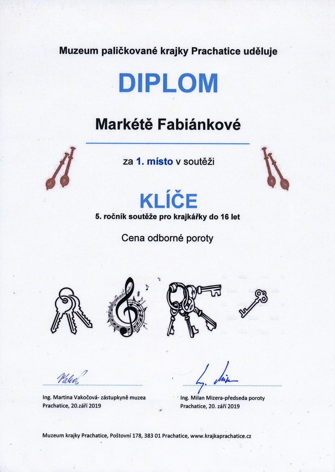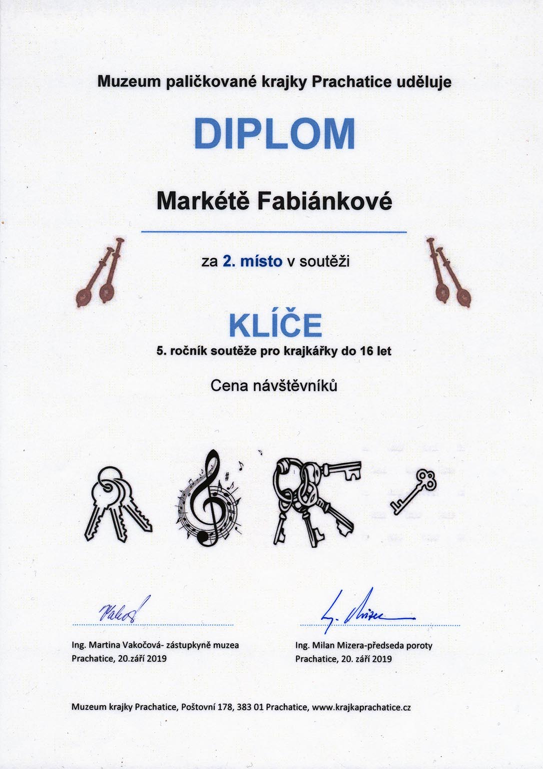 Svůj hotový klíč jsem odeslala poštou do Prachatic a mailem mi došlo potvrzení, že práce dorazila v pořádku a že se soutěže zúčastnilo 38 děl z Česka, ale i ze Slovenska. Jsem ráda, že jsem se mohla opět této soutěže zúčastnit a uvidíme další rok, jestli se zúčastním. Bude to asi naposledy, jelikož soutěž je pouze do 16 let, a mě už následující rok bude tolik.