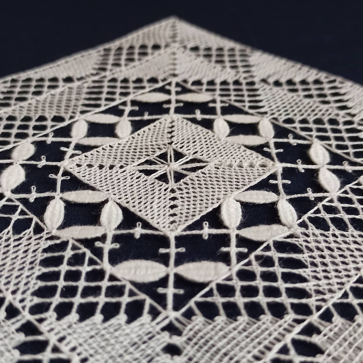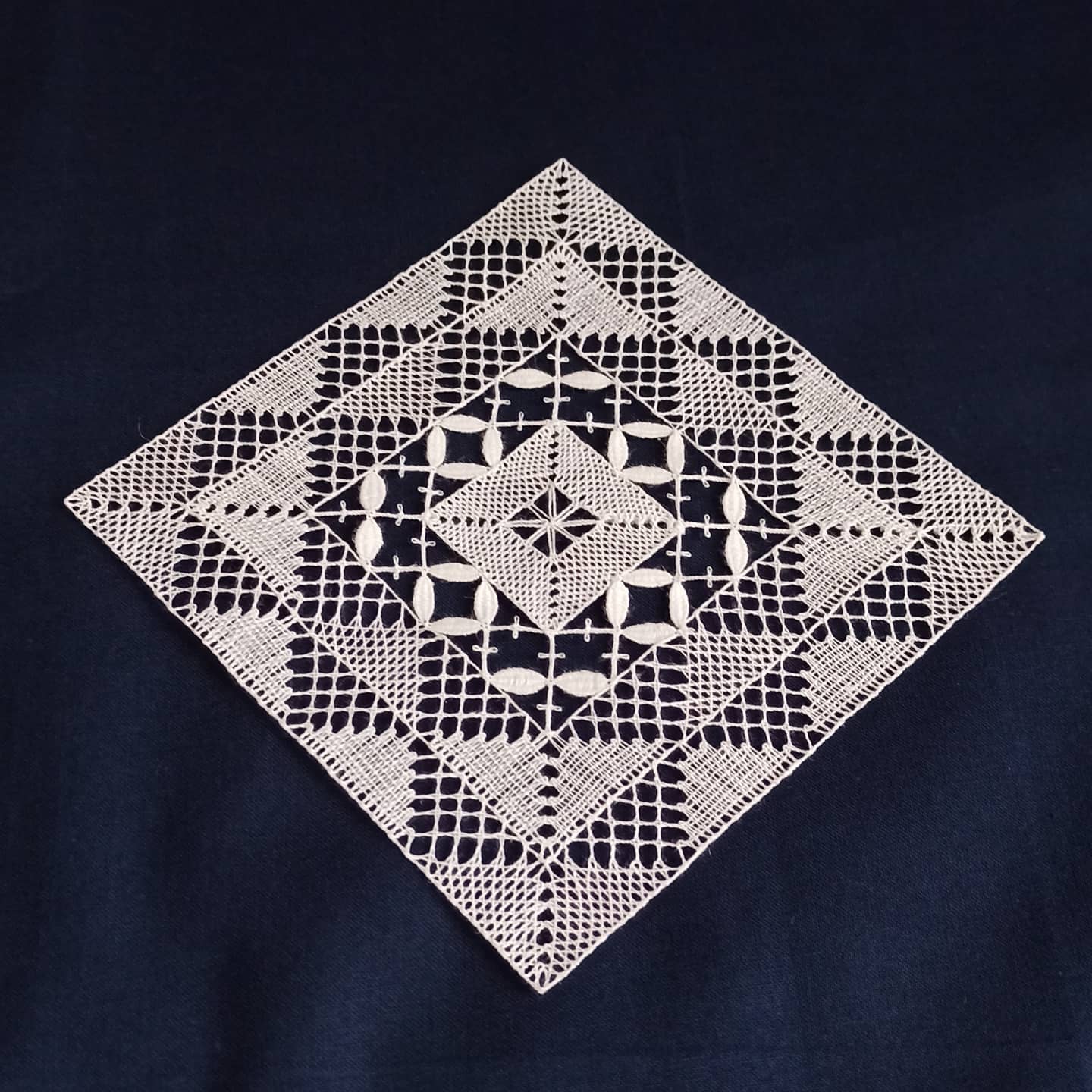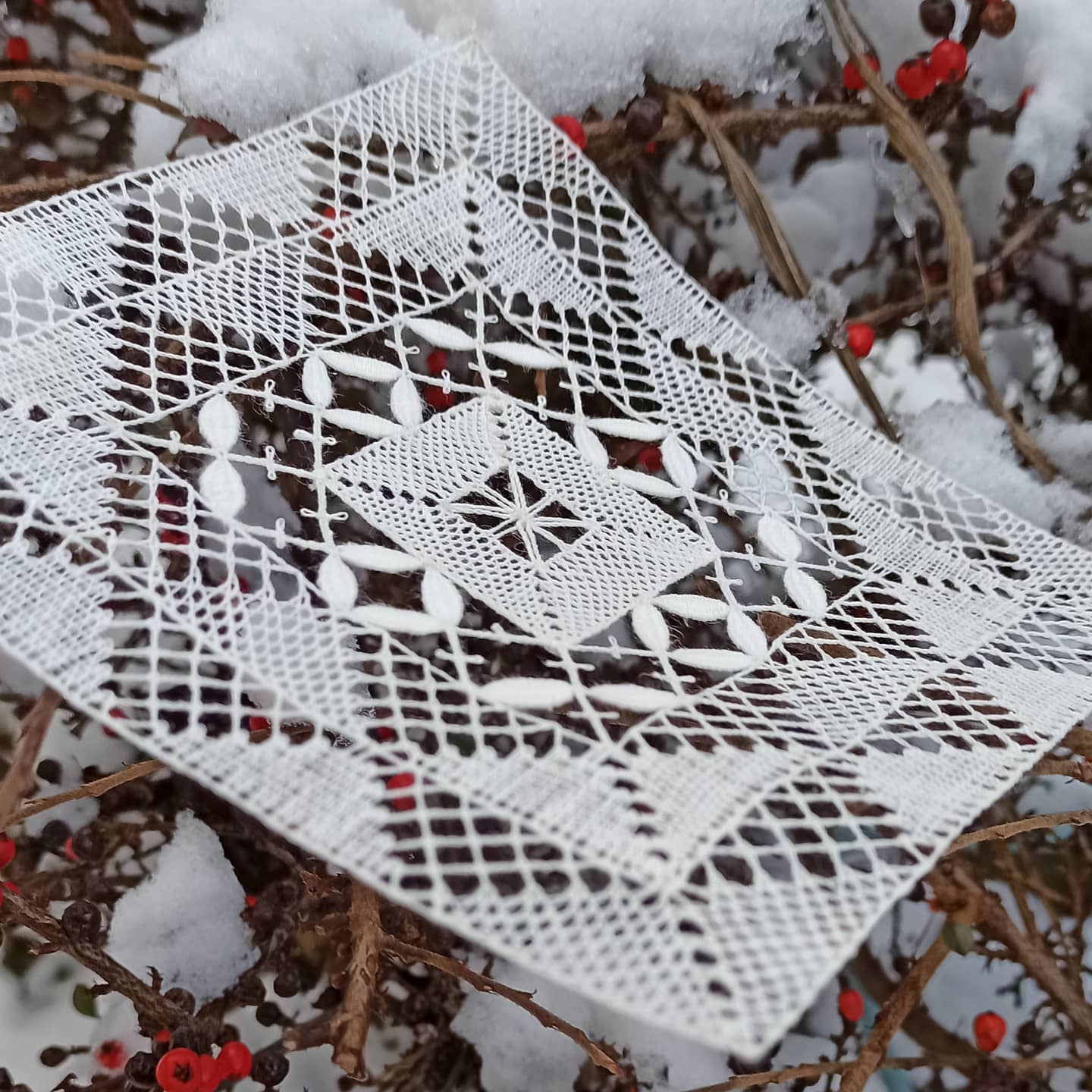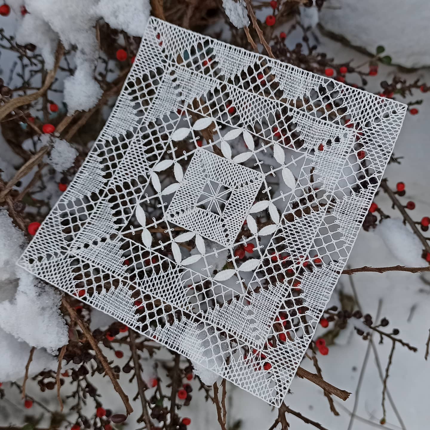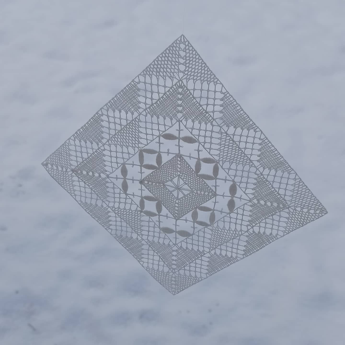 Jako další práci jsem dostala upaličkovat čtverec podle podvinku Emilie Paličkové-Mildeové. Na tuto práci jsem zvolila lněnou přízi. Čtverec se skládal ze čtyř čtverců. Nejdříve jsem upaličkovala obvodový čtverec, pak jsem k němu přidala další. Poté jsem udělala středový nejmenší čtvereček a nakonec jsem upaličkovala zbývající čtvereček z lístečků a pikotek, který vše spojil.