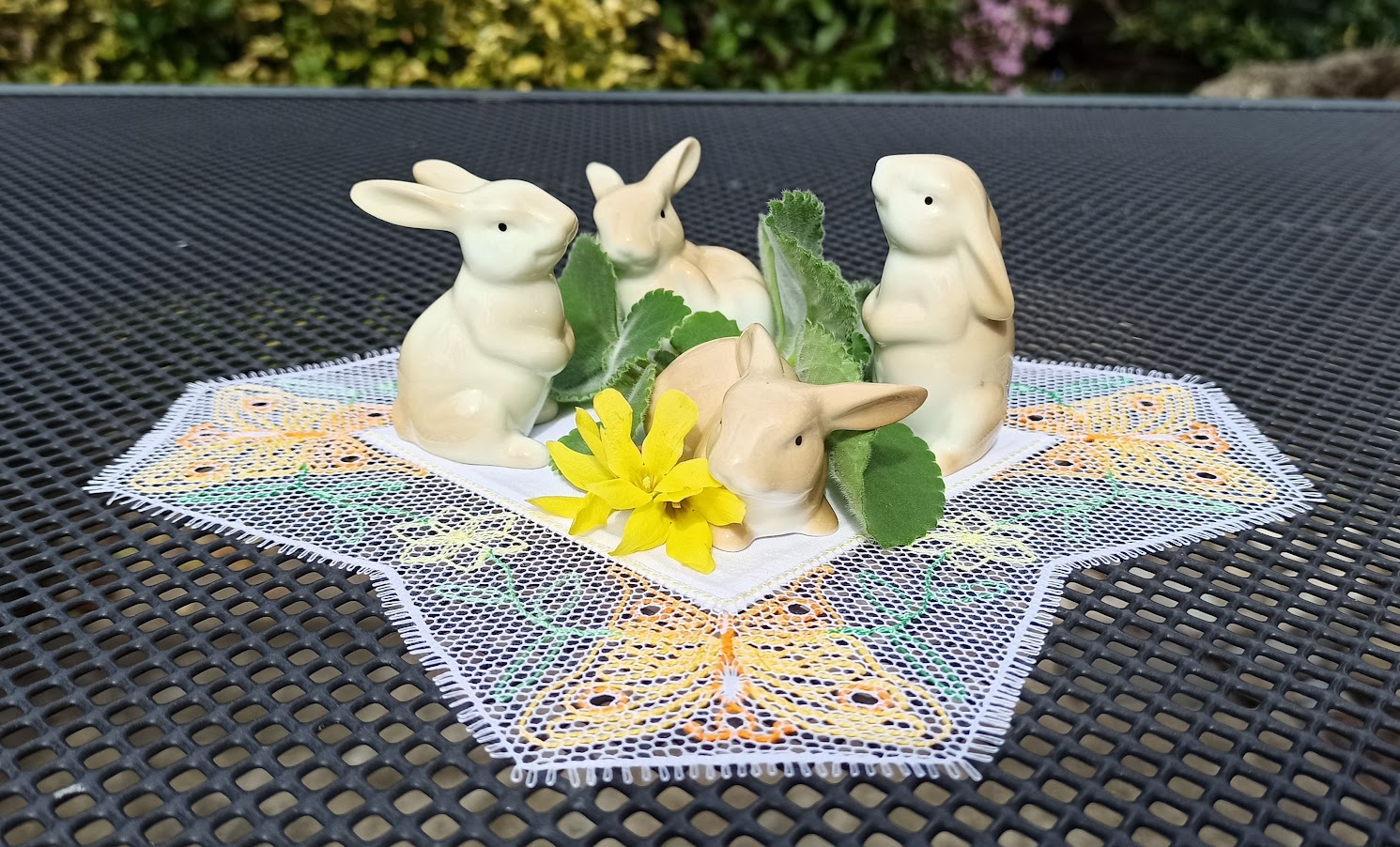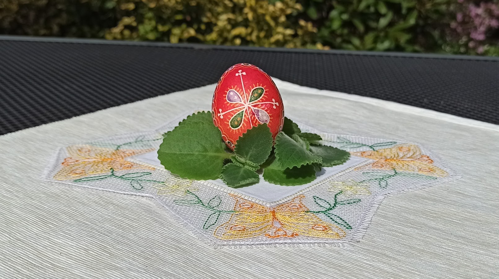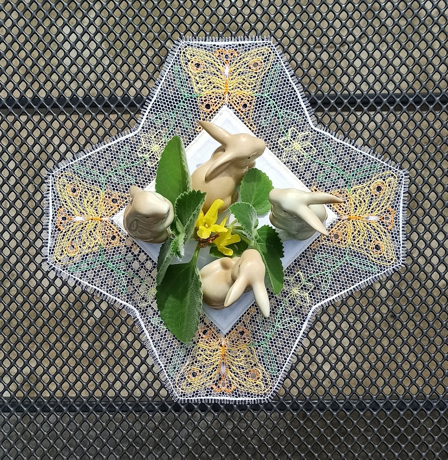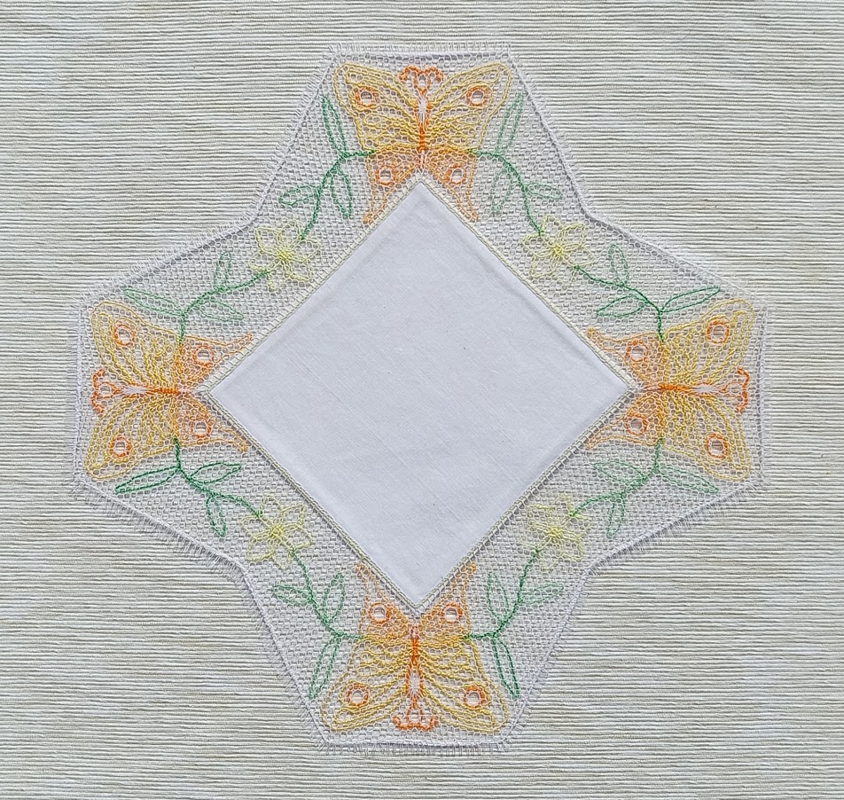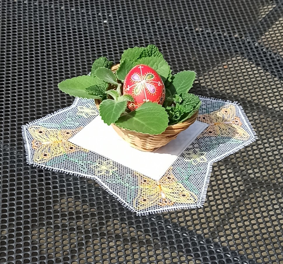 Dalším úkolem bylo vymyslet a upaličkovat čtvercový okolek. Jelikož začínalo jaro, inspirovala jsem se motýly, květy a listy. Vše jsem vložila do vláčky v netypickém tvaru čtverce. Upaličkovat to bylo těžší, zvlášť když jsem s vláčkou teprve začínala, hned jsem si navrhla něco složitějšího. Trvalo mi dlouho, než jsem přišla na to, jak upaličkovat listy, květ a zvláště motýla v rohu a také kde třeba začít a jak vkládat obtahovačku, protože jsem se s ní musela v některých částech vracet a ještě jsem musela na kraji ubírat a přibírat páry. Dalo mi to časově zabrat, ale měla jsem na vypracování, jak dlouho jsem chtěla. Rozhodla jsem se ale, že to chci mít do velikonočních prázdnin hotové, jelikož je to jarní okolek. Tak jsem si na to od začátku velikonočních prázdnin sedla a paličkovala od rána do večera. Každý den jsem měla v plánu udělat danou část. Nakonec jsem to na velikonoční neděli dopaličkovala. Další den jsem krajku přišila, ale přišití není úplně dokonalé. Okolek jsem si pěkně nafotila a s celkovou prací jsem hodně spokojená.