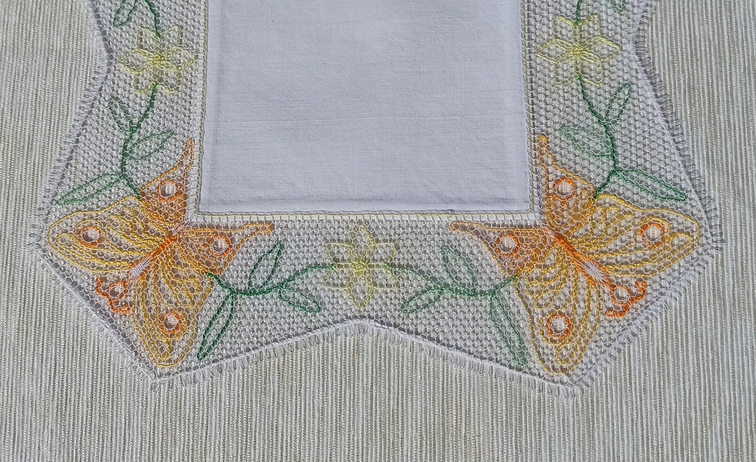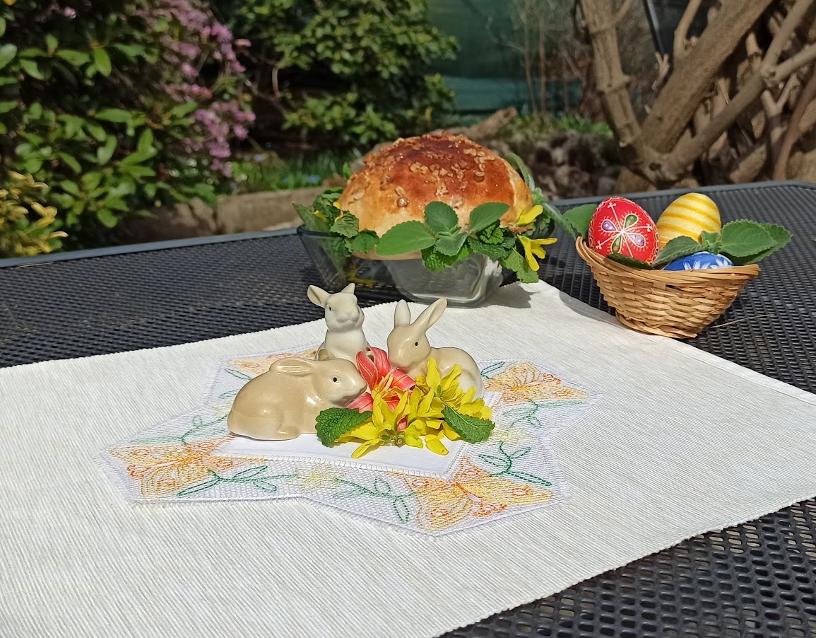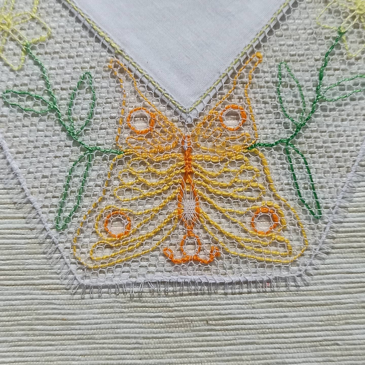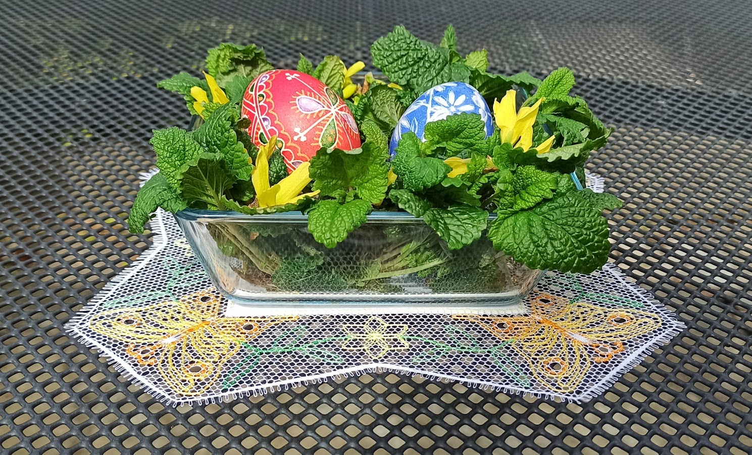 Dalším úkolem bylo vymyslet a upaličkovat čtvercový okolek. Jelikož začínalo jaro, inspirovala jsem se motýly, květy a listy. Vše jsem vložila do vláčky v netypickém tvaru čtverce. Upaličkovat to bylo těžší, zvlášť když jsem s vláčkou teprve začínala, hned jsem si navrhla něco složitějšího. Trvalo mi dlouho, než jsem přišla na to, jak upaličkovat listy, květ a zvláště motýla v rohu a také kde třeba začít a jak vkládat obtahovačku, protože jsem se s ní musela v některých částech vracet a ještě jsem musela na kraji ubírat a přibírat páry. Dalo mi to časově zabrat, ale měla jsem na vypracování, jak dlouho jsem chtěla. Rozhodla jsem se ale, že to chci mít do velikonočních prázdnin hotové, jelikož je to jarní okolek. Tak jsem si na to od začátku velikonočních prázdnin sedla a paličkovala od rána do večera. Každý den jsem měla v plánu udělat danou část. Nakonec jsem to na velikonoční neděli dopaličkovala. Další den jsem krajku přišila, ale přišití není úplně dokonalé. Okolek jsem si pěkně nafotila a s celkovou prací jsem hodně spokojená.